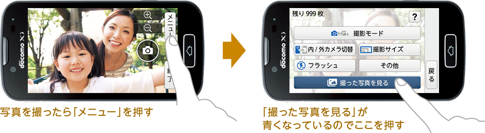 写真を撮ったら「メニュー」を押す ⇒ 「撮った写真を見る」が青くなっているのでここを押す