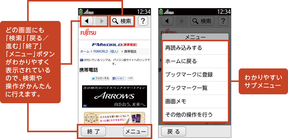 どの画面にも「検索」「戻る/進む」「終了」「メニュー」ボタンがわかりやすく表示されているので、検索や操作がかんたんに行えます。/わかりやすいサブメニュー