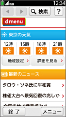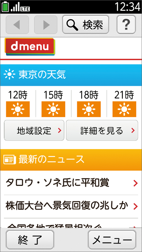 文字やアイコンの表示を大きくし、世代や性別を問わず使いやすく設計した、らくらくスマートフォンシリーズ向けdメニューをご用意。メニュー構成がシンプルでわかりやすくなっています。また、並び順もニュース・天気・生活情報など知りたい情報へかんたんにアクセスできるようになっています。
