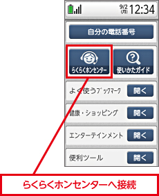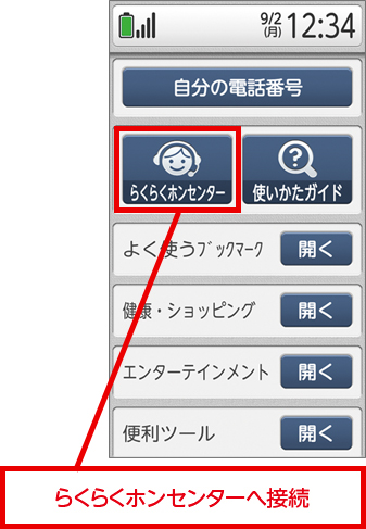 専門のアドバイザーが操作方法などをやさしく教えてくれる、「らくらくホンセンター」。センターにワンタッチでつながる専用ボタンを押すだけで、わからないことを気軽に相談することができます。