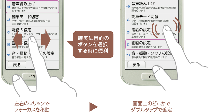 左右のフリックでフォーカスを移動 確実に目的のボタンを選択する時に便利 ⇒ 画面上のどこかでダブルタップで確定