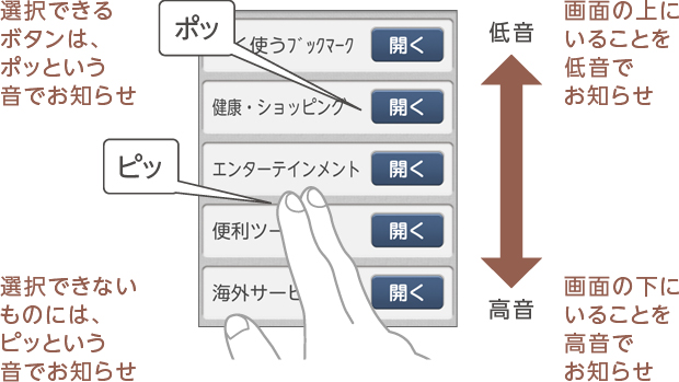 選択できるボタンは、ポッという音でお知らせ/選択できないものには、ピッという音でお知らせ/画面の上にいることを低音でお知らせ/画面の下にいることを高音でお知らせ