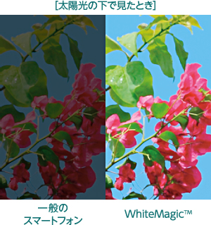 消費電力を最大約50%削減できる次世代省電力液晶「WhiteMagic™」を採用しました。さらに、従来のRGB画素に「W(ホワイト)」画素を加えたことで最大輝度が約900cdまで上がり、晴れた日の屋外などでも明るく見やすく表示することができます。