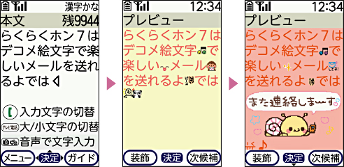 文章に合ったデコメ絵文字を自動で挿入するおまかせ絵文字が、デコメールに対応。華やかなメールをかんたんにつくれます。