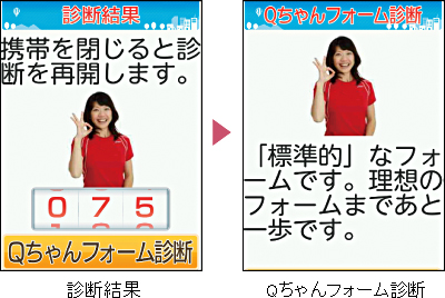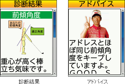らくらくホン7を腰に取り付けてスウィングするだけで、スウィングフォームを測定できます。測定データを基に、江連忠氏による理想のスウィングに近づけるための診断やアドバイスが表示されます。