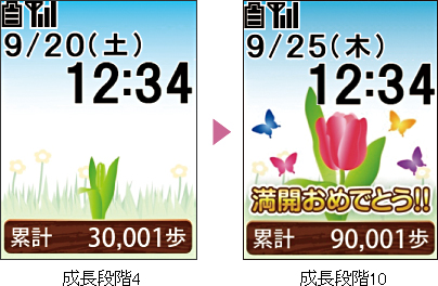 歩数計に連動した待受画面(背面)をご用意しました。歩数が増えるほどに、10種類の花が成長して小鳥や蝶などのアニメーションがランダムに登場します。