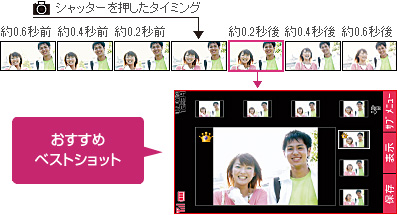 シャッターを1回押すと7枚の写真を高速連写し、その中からベストな1枚を自動的にセレクト。人物撮影時は、まばたき/ブレ/笑顔度を総合的に評価してセレクトするので、最高の1枚を保存できます。13Mの画像サイズまで対応可能です。