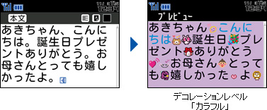 テキストのみで作成したメールでもワンタッチで、デコレーションメールに変換できます。たくさんのデコレ―ション候補から、気分に合わせてお好みのデコレーションを選べます。
