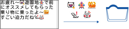 お気に入りのデコレーション絵文字にオリジナルの「よみ」を登録することで、デコレーション絵文字が変換候補の中に表示されます。データフォルダからデコレーション絵文字のよみ登録・編集もできるようになりました。