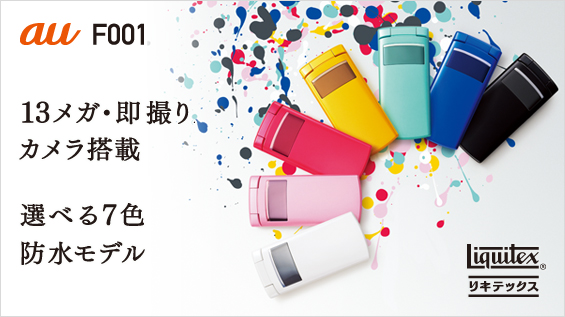 F001は、世界的なアクリル絵の具ブランド「Liquitex」とコラボレーションをした、カラフルな7色モデル展開が特長の携帯電話です。