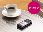 ![]() 普段使っているオフィスPCとの同期もUSB(別売)やBluetooth通信を使えばラクラク | ![]() 会社や自宅で使っているメールを外出先でも送受信可能 | ![]() ドコモ公衆無線LAN対応のカフェで快適インターネット | ![]() Bluetooth機能を使って、Windows® ケータイ F1100に入れた音楽データをワイヤレスで鑑賞 |