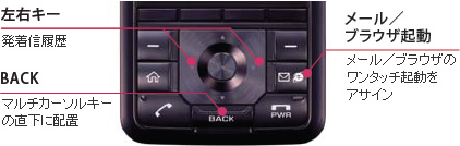 ケータイ同様の操作を実現するために、Windows® ケータイ F1100はキー配列をカスタマイズ。発着信履歴確認を左右キーに割り当てたり、メール/ブラウザ起動をマルチキーのサイドに割り当てたりと、ケータイの使いやすさも追求したキー配列です。