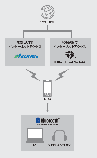 FOMA通信に加え、無線LANやBluetooth通信といった豊富なネットワーク環境に対応しています。もちろん、インターネットにも直接つながるので、PC向けホームページをはじめ、普段PCで利用しているプロバイダのメールもPCと同じ感覚で利用できます。