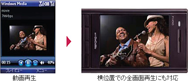 PCで利用しているWMA(注10)/MP3の音楽データや、WMV/ASF形式の動画をWindows® ケータイ F1100で楽しめます。また、インターネット上などにあるコンテンツのストリーミング再生にも対応しています。