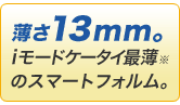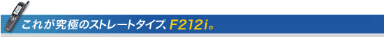 | いつも使うものこそ、スマート&シンプルでありたい。胸ポケットに入れても気にならない、厚さ13mm※のスマートフォルム。 持ち歩くツールとして考えられた便利で安心な機能。これが究極のストレートケータイ、F212i。 ※突起部除く。 |