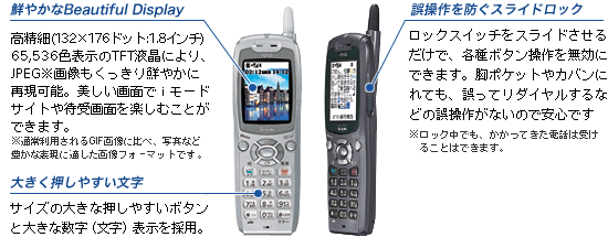 | *1 1件につき電話番号3件、メールアドレス3件を登録できます。 *2 TFT(Thin Film Transistor):コントラスト・色の再現性・応答速度・視野角などが優れたカラー液晶です。 *3 PCM(Pulse Code Modulation)音源:実際の楽器などの音を録音して、さまざまな音色を表現しています。 |