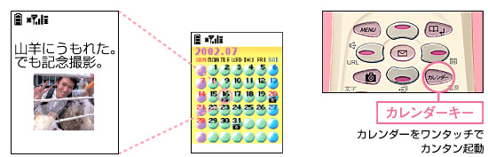 | F251iのカレンダーには撮った写真を貼り付けることができるので、フォト日記的な使い方ができます。 |