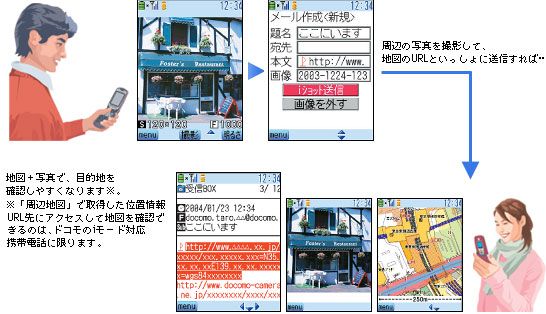 ワンボタンで測位位置を表示することができます。さらに、その位置をメールで送信したりカーナビに転送することも可能なうえ、周辺スポット検索も手軽に行えます。