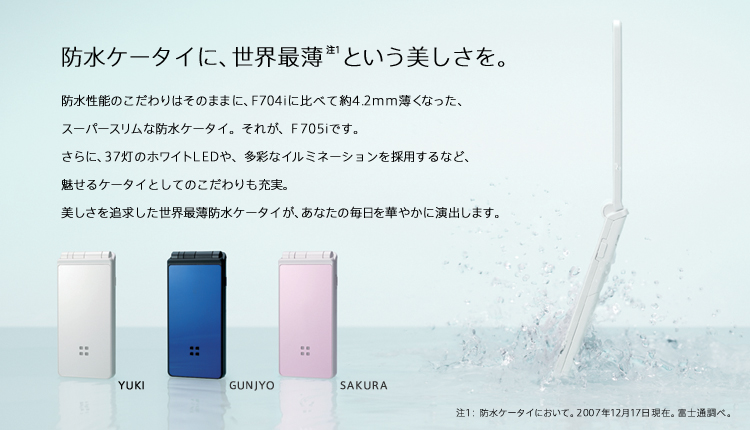 優れた防水性能はそのままに、約13.7mmという薄型化に成功したF705i。防水性能だけでなく、ケータイのデザイン性も大切に考えました。