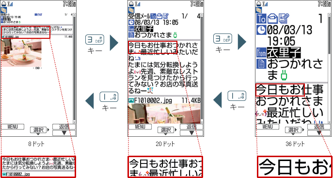 受信メール閲覧時にワンタッチの簡単操作で本文表示の拡大・縮小が8段階で行えます(1キー:縮小、3キー:拡大、2キー:元サイズ)。周囲の視線が気になる場所では、いつもより文字を小さくしてメールチェックすることもできるので、のぞき見防止をはじめ、さまざまなシーンで役立ちます。