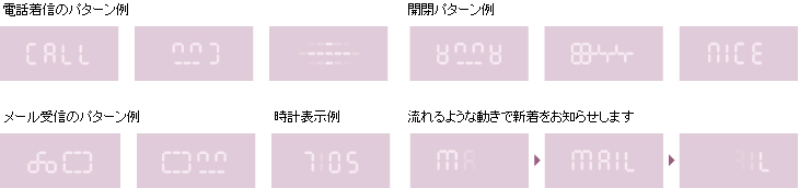 何もないところから浮かび上がる37個のLEDを使ったフローティングサインが、時刻や情報を表情豊かにお知らせします。閉じたままでも楽しいパターンで着信相手をお知らせしたり、誰からの新着情報かを確認できたりするなど、使い方は多彩。さらに、60種類の開閉パターンが楽しさを演出。また、各カラーのパネル色によって異なった色味を表現したりなど、便利さ、美しさにこだわりました。
