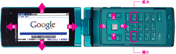 大きく見やすい約2.7インチのフルワイドQVGA液晶を搭載。フルブラウザを快適に楽しめる横画面表示では、マルチカーソルキーの操作方向も90度回転します。ケータイを縦にしても横にしても、直感的なキー操作が可能(1キー:縮小、3キー:拡大)。ストレスのない使い心地で、フルブラウザの快適性をさらに高めます。