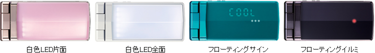 自分だけのお気に入りのイルミネーションカラーを楽しんでいただけるよう、50種類のフローティングイルミをご用意しました。さまざまなカラーできらめくヒカリが、ケータイの開閉や着信時のサインを美しく演出。毎日の気分にぴったりのカラーを自在に選べます。