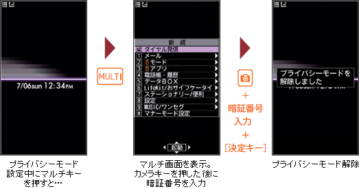 F706iでは、これまでプライバシーモード解除時に現れていた認証画面を非表示にできるステルス認証方式を採用。隠していることも隠したいというデリケートな気持ちに配慮しました。