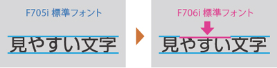 見やすさを追求し、らくらくホンで好評だった「丸ゴシック」フォントを新たに標準フォントとして採用しました。ひらがなを若干小さくし文字間に適度な空白を持たせることで、文章を読みやすくした目に優しいフォントです。