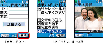 メール作成画面時に表示される「簡単」ボタンを押せば、ガイドに沿っていくだけでかんたんにメール作成が行えます。さらに、撮影した写真や動画を送ることもできます。