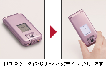 らくらくホンVを持ち上げて傾けると、自動的に背面液晶のバックライトが点灯します。暗い場所で時間を確認したいときなどに便利です。