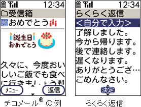 デコメ®テンプレート(70件)に加え、豊富なデコメ®ピクチャ(60件)を使ったデコメール®もかんたんにつくれるようになりました。画像を選ぶと自動でレイアウトまでしてくれます。また、手軽に相手に返信できる返信用本文もご用意しました。