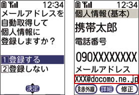 自分のメールアドレスを、センターから自動的に取得できます。そのまま個人情報に登録することができるので、赤外線通信で自分のプロフィールを送信する際に、メールアドレスが登録されていない、という心配もありません。