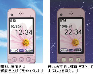 周囲の明るさを感知して、液晶画面を明るさに応じた輝度に自動調整します。明るい場所では液晶の輝度を上げて明るく、暗い場所では輝度を落とし、まぶしさを抑えた液晶画面にしてくれます。