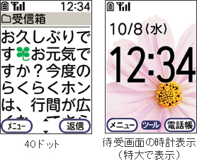送信メールや受信メールの文字をさらに大きく表示できるようになりました。最大で40ドットの大きさでメールを楽しめます。また、待受画面の時計表示も大きくしたことで、これまで以上に見やすくなりました。
