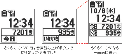 らくらくホンIVSと比べ背面液晶の大きさ・解像度が向上し、情報の表示量が増えました。また、情報の表示切り替えも効率がアップ。これまで音声読み上げボタンで切り替えが必要だった情報も、一画面の中で表示できるようになりました。