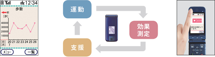 らくらくホンVでは、歩数計に加えて脈拍計も新搭載。さらに株式会社タニタの体組成計との連携も行えるなど、使う人の健康をサポートするiアプリ®「健康生活日記」をご用意しました。