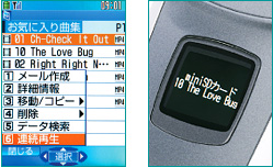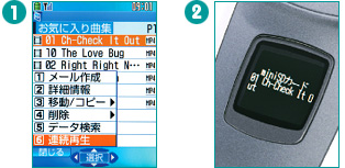 再生したい曲を選ぶ際に、「MENU」から「連続再生」の選択で、記録されているすべての曲を再生できます。このとき、ケータイを閉じた状態にすれば、背面ディスプレイには、曲名が表示されます。