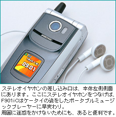 本体背面にステレオツインスピーカーを搭載しているF901iC。通常、本体に記録された着信メロディーや、miniSDメモリーカードに記録したハイクオリティーな音楽データは、このツインスピーカーから奏でられます。お気に入りの音楽を集めた自分だけのF901iCです。なので、せっかく音楽を楽しむなら他人に干渉されない状態で、じっくりと音楽を満喫したいもの。そんなときは、平型ジャックに対応した市販のステレオイヤホンを使うといいでしょう。周囲への音漏れを気にすることなく音楽が楽しめます。