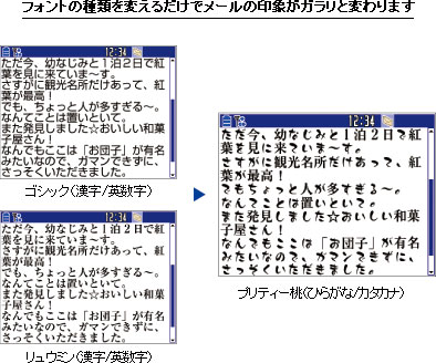 F903iには、メールがさらに楽しくなる工夫が満載。リュウミンフォント、ゴシックフォントに加え、かわいらしい書体(ひらがな/カタカナ)が魅力の「プリティー桃」などといったダウンロードフォントに対応しており、これまで以上にメールを楽しめます。