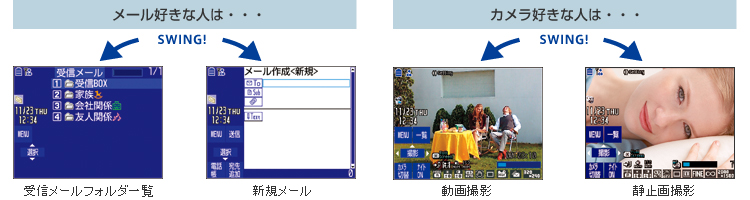 待受画面の状態から画面を右へ左へとスイングさせるだけで、使いたい機能をすぐに起動することができるヨコモーション。もちろん、ライフスタイルに合わせて、スイングで起動する機能を変更することも可能。 F903iなら、タテ画面からヨコ画面まで自由自在に楽しめます。