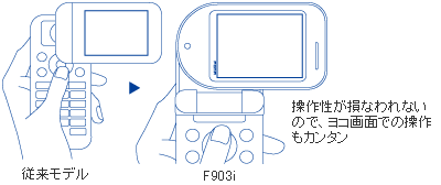 F903iは、ヨコ画面にしても、タテ画面時と同じようにすべてのキー操作をスムーズに行うことができます。これまでのヨコ画面対応ケータイにありがちだった、画面が邪魔をして十字キーの操作ができなくなるといった心配もないので、ストレスなくヨコ画面を使いこなせます。