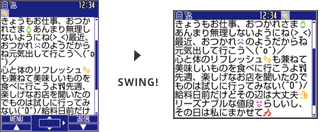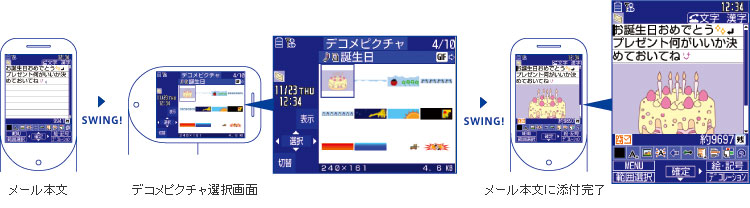 メール作成・文字入力画面からスイングを行うことで、いままで以上にメールの使いやすさがアップ。これまで複数の手順が必要だった、定型文や、絵文字、デコメピクチャなどの呼び出しが、スイングひとつで呼び出せます。もちろん、好みに合わせてスイングの組み合わせを変更できます。