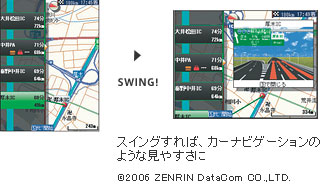 F903iでは、自分の居場所がケータイでわかるGPSiアプリを搭載。スイングすれば、タテ画面時に比べて左右の地図領域がアップするので、まるでカーナビゲーションのような見やすさで自分の位置を確認できます。