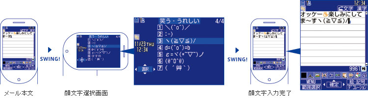 これまでメール作成画面から複数の操作が必要だった顔文字や定型文も、スイングで呼び出し&入力可能に。ほかにも、絵文字や記号など自分のスタイルに合わせて文字入力を行えます。