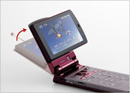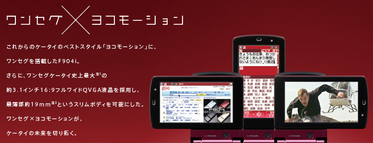 F904iは、画面をスイングするだけで、使いたい機能を一発で呼び出せるヨコモーションに対応。ワンセグ鑑賞に最適なスタイルなのはもちろん、カメラ撮影や、フルブラウザ閲覧などにも便利です。また、すべてのキーをタテ画面時と同じように操作できるのも大きな特長です。