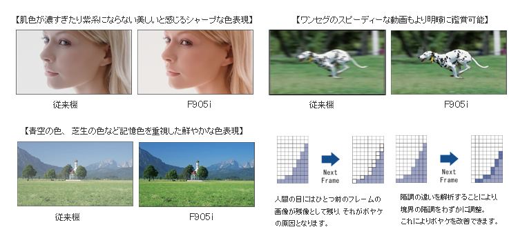 どの角度から見ても画像が美しいスーパーファインIPS(In-Plane-Switching)液晶に加え、FMVシリーズで培った画像処理技術をケータイ用へと最適化。これにより、“シャープ・鮮やか・肌色きれい”といったFならではの色表現の実現に成功しました。さらに、暗いシーンでもより「明るく」見せる自動コントラスト補正技術や、動きの速い映像をクリアに捉える新技術を採用するなど、映像表現にこだわりました。