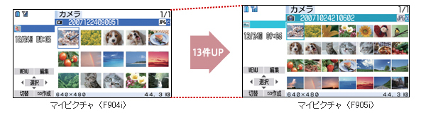 3.2インチの大きさを活かし、サムネイル一覧の表示件数もヨコ画面時で15件から28件へと大幅にアップ(タテ画面時は20件から30件にアップ)。静止画はもちろん、デコメール®テンプレートも一覧で見ることができるので、メール作成などもより手軽に楽しく行えます。