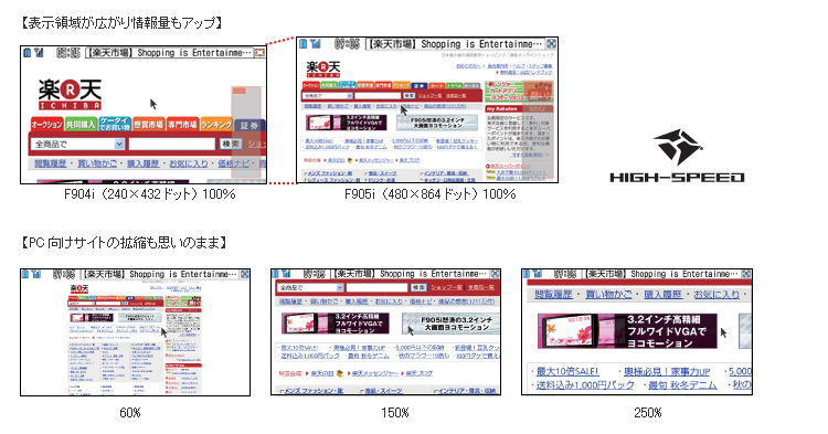 フルブラウザの性能がアップしました。7段階の拡縮倍率が手軽に行えたり、ページサイズが0.5MBから1.2MBにアップしたりと、使いやすさもPCクラス。Googleマップをはじめ、PC向けサイトを約80%(注2)カバーするなど、閲覧できるサイトも増えました。さらに、F905iは、ハイスピード対応なので表示速度やサイト接続もスムーズ。PC向けサイトをヨコ画面いっぱいに表示すれば、ヨコ方向のスクロール量が少なくなるので、より快適に閲覧できます。また、F905iなら、ヨコ画面のまま文字入力も可能。「高精細」「ハイスピード」「ヨコモーション」という3つの機能が、フルブラウザの快適性をさらに高めます。