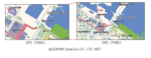 F905iはフルワイドVGAの高精細液晶。そのため、GPS対応iアプリ®の地図表示画面もこれまで以上に美しく表示することが可能になりました。細い道なども拡大することなくチェックできます。